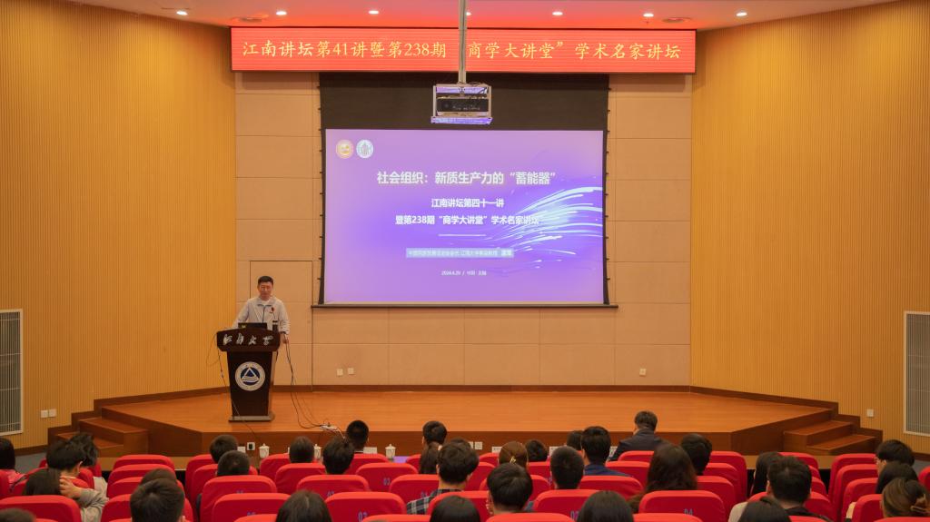 4月20日晚,江南大学江南讲坛第四十一讲暨第238期“商学大讲堂”学术名家讲坛在103远东报告厅举办,我校特邀中国民族贸易促进会会长蓝军作题为《社会组织:新质生产力的“蓄能器”》的学术讲座。校党委常委、副校长倪松涛,国家安全与绿色发展研究院教授陈红、龙如银等出席活动,江南大学师生校友共200多人参加了讲座,活动由至尊z9999全讯院长浦徐进主持。