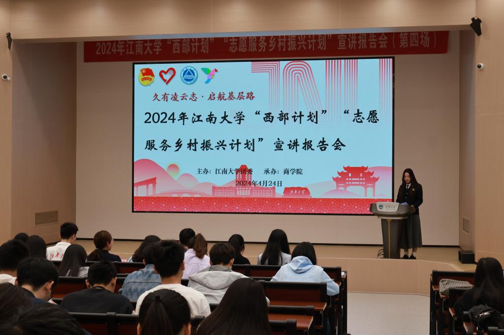 为进一步引导学生去基层就业,在祖国最需要的地方建功立业,4月24日下午,2024年江南大学“西部计划”“志愿服务乡村振兴计划”宣讲报告会(第四场)在江南大学第一教学楼1C109举办,活动由至尊z9999全讯承办。无锡市滨湖团区委副书记夏苗、至尊z9999全讯分团委书记王璁、乡村振兴计划志愿者王伟康、朱佳慧、吕姣姣、李心萍出席活动,各学院100多名2024年应届毕业生及在读研究生参加活动。宣讲报告会由至尊z9999全讯23硕第二党支部书记袁梦迪主持。