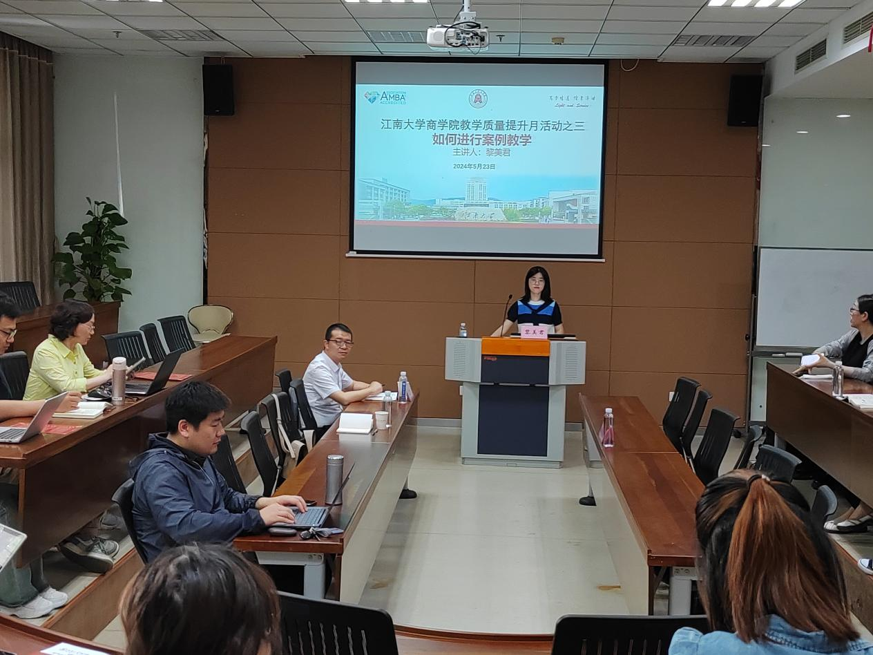 为进一步推进学院教师在教学过程中产教融合深度,北京百智享科技有限公司华东运营中心总经理王逸飞、培训主管黎美君女士应邀于5月23日到访并进行座谈交流。会上,黎美君女士就《如何进行案例教学》为全院教师做了专题讲座,重点对案例开发、案例库建设以及案例教学在本科培养过程中的重要意义向参会教师进行了详细介绍,指出强化案例教学是实现教学与实践有机融合、优化本科生培养模式的有效手段。在互动交流环节,黎美君针对参会教师提出的“如何把握教学案例的切入点”“如何提高教师案例研发兴趣”等问题进行了深入讲解并提出合理化建议。