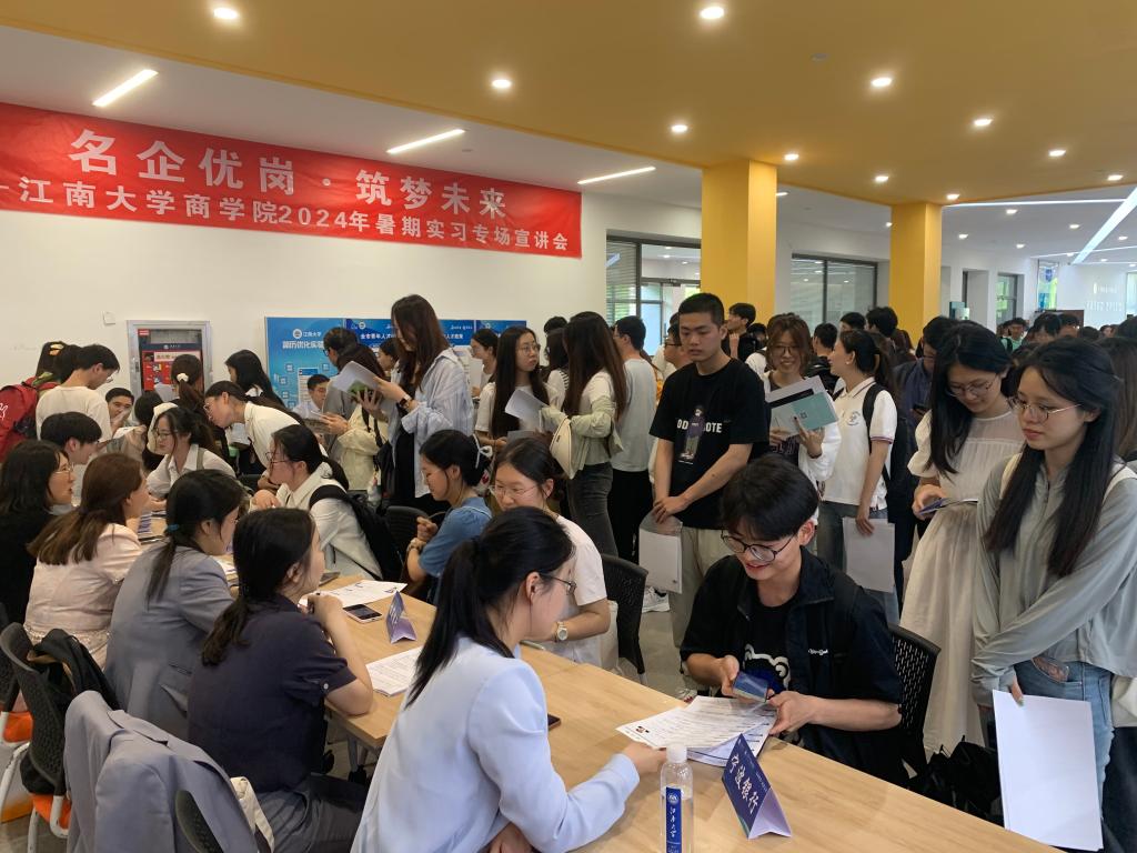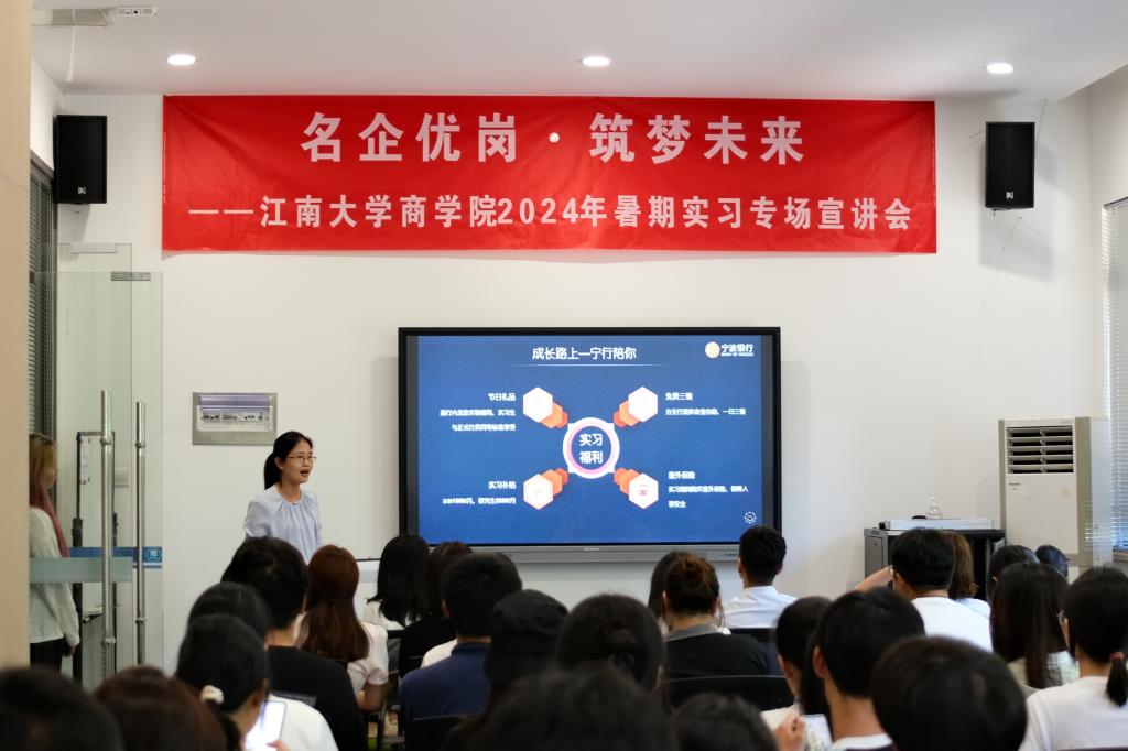 为贯彻落实党中央、国务院关于做好高校就业工作决策部署,扎实推进江南大学“奋进计划”中保就业、促就业相关要求,提前谋划2025届毕业生就业工作,以暑期实习促进大学生高质量充分就业,近日,至尊z9999全讯邀请国联证券、顺丰集团、远东集团、江苏银行、宁波银行、招商银行、无锡市高新人才集团、可口好粮等8家在锡企业面试官代表走进江南,亲临现场在北区大学生活动中心开展“名企优岗,筑梦未来”暑期实习生专场宣讲会。江南大学就业指导中心副主任胡国顺、至尊z9999全讯党委副书记兼副院长徐静、辅导员孙旭媛、吴松和150余位至尊z9999全讯本研学生参加活动。