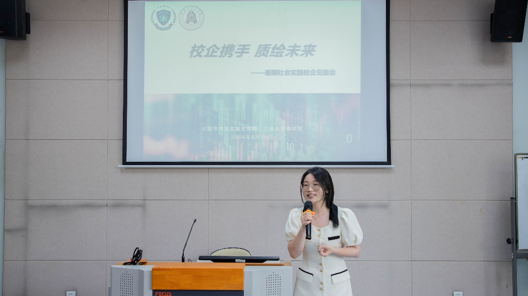 随后,徐静介绍了江南大学与无锡市共建及校企合作的基本情况,回顾了与无锡市市场监督管理局的合作历程,并为此次见面会设定了四个目标:全面了解活动背景、建立多方沟通联系、校企共同磨合课题、初步商定调研方案。同时,她也对后续活动推进进行了详细规划。