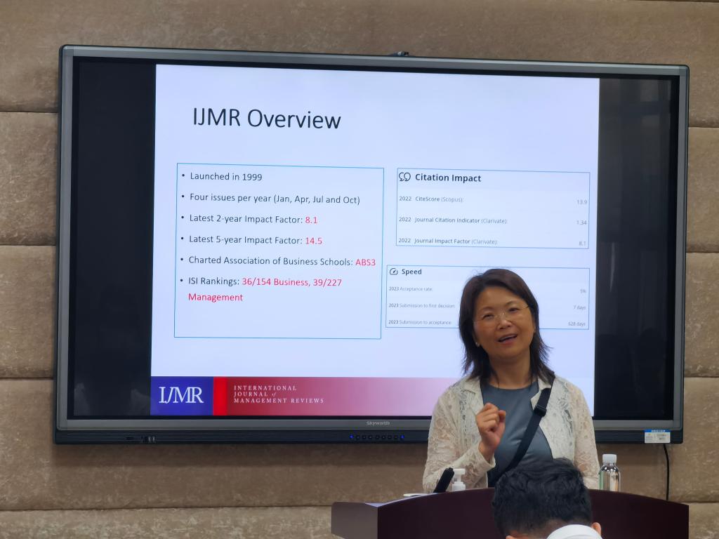 曹教授首先分享了她的研究成果和专长,并与同学们互动探讨了研究热点。随后,曹教授重点介绍了International Journal of Management Reviews(IJMR)期刊。IJMR是影响因子高达8.1的顶级刊物(ABS 3*),主要刊登组织与管理研究(OMS)和战略管理领域的文章,以其重大概念贡献、新研究方向和影响力著称。