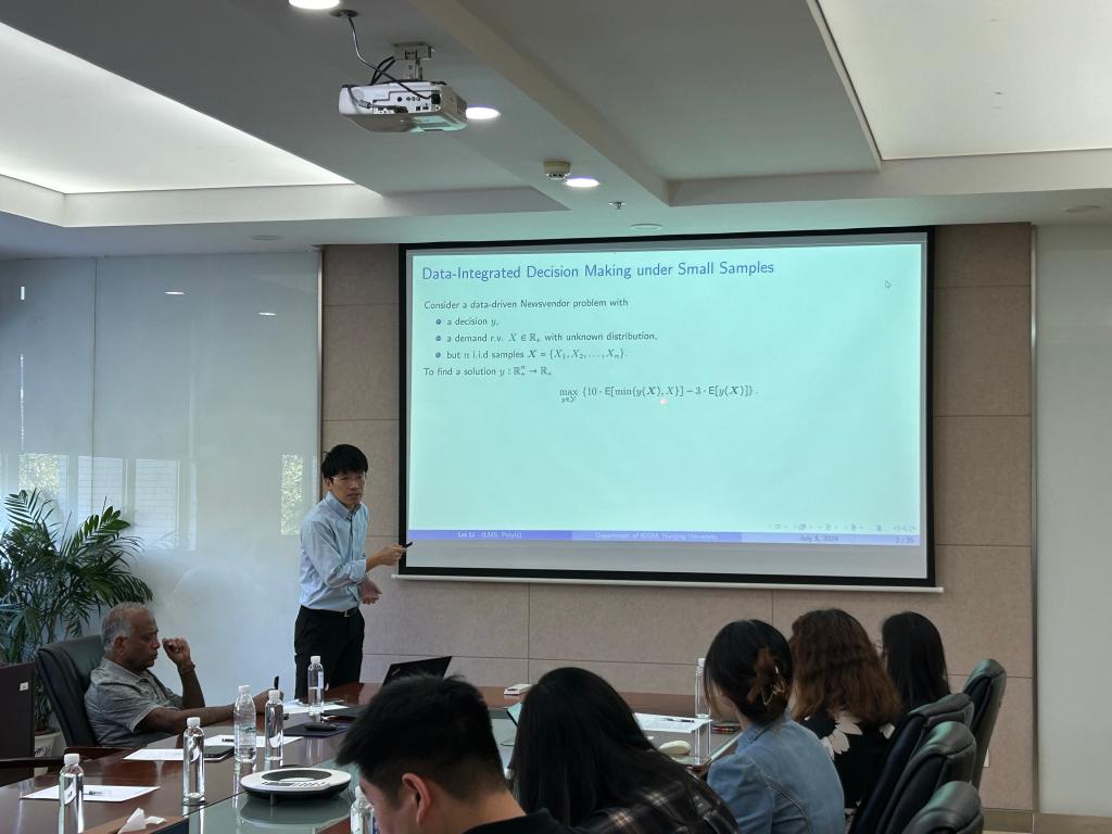 李磊副教授在报告中聚焦于Operational Data Analytics(ODA),深入探讨了其在跨相关系统学习中的应用潜力。以经典的报童问题为例,李磊副教授有力地论证了迁移学习的价值,利用从一个相关且数据丰富的系统中预训练的模型,可以有效提升目标(或焦点)系统在数据有限情况下的决策效能。此外,李磊副教授特别强调了领域知识的融入以及数据与决策之间复杂结构关系在构建高效学习解决方案时的核心作用。最后,李磊副教授强调尽管展示的是报童模型问题,但ODA所提供的解决方案具有广泛的普适性,能够应用于众多展现出相似同质特性的运营决策问题中,为这些领域的数据驱动决策提供了强有力的支持。