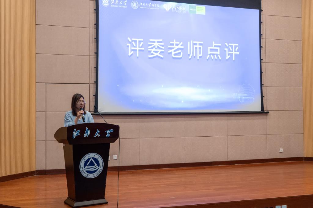 比赛结束后,案例中心主任马骏副教授代表指导老师发言,马老师表示学生团队认真准备,表现出MBA学子的精神风貌,案例课程收获良好,案例中心会持续做好案例开发和研究工作,助力学院高质量发展。评委主席钱文颖和其他四位评委分别对同学们的表现一一点评,大家充分肯定了参赛队员案例写作的规范性、教学说明设计的专业型都有了很大的提升,高度赞扬了赛事组委会精心的准备工作和专业多元化的评审机制,期待江南大学为中国工商管理领域持续带来更多、更好的江南故事。