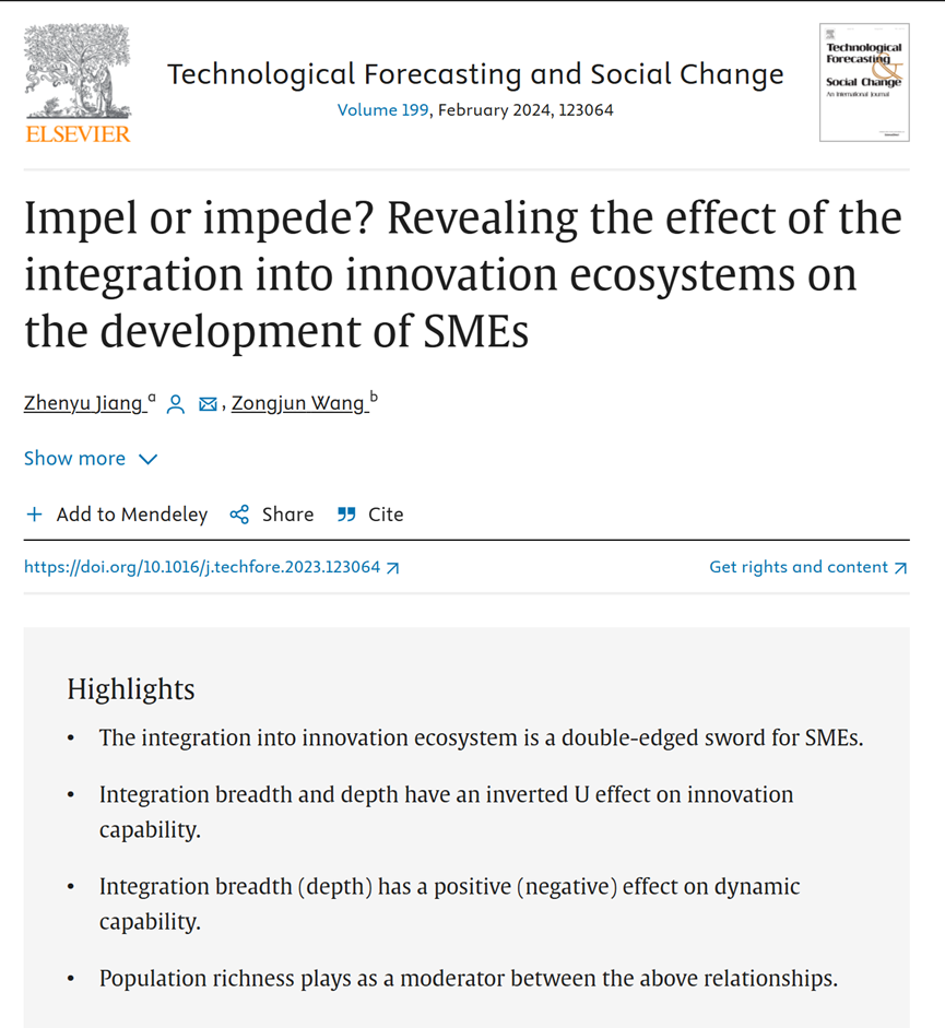 近日,国际权威期刊《Technological Forecasting and Social Change》正式刊发了我院蒋振宇老师作为第一作者与合作者共同完成的论文“Impel or impede? Revealing the effect of the integration into innovation ecosystems on the development of SMEs”(推动还是阻碍?揭开创新生态系统融入对中小企业发展的影响)。