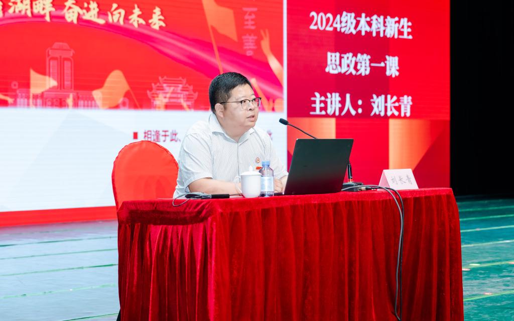 刘长青以《青春启征程,一起“商”未来》为主题为2024级新生讲授思政第一课。他从“千里赴江南,传承智与长”“少年负壮气,奋进自有时”“百年正风华,圆梦新征程”三个篇章展开,为同学们阐明“大学是什么,大学如何培养人?”“新生如何适应大学,如何规划大学生涯?”两个关键问题。他寄语2024级新同学:胸中有沟壑,眼底存山河,执着追梦、拼搏无悔,不畏困难、敢于突破,用奋斗谱写最美的青春赞歌!