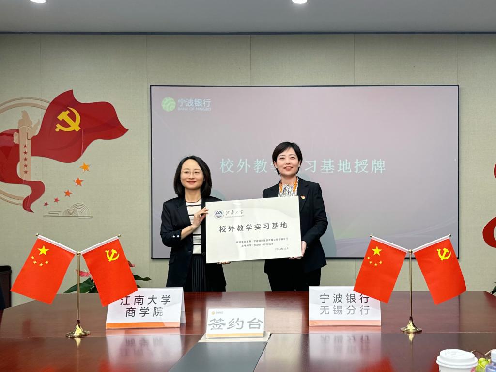 签约仪式结束后,孙小芳为宁波银行无锡分行授予江南大学“校外教学实习基地”工作牌,为深化产学研深度合作、促进学生高质量就业强化力度保障。